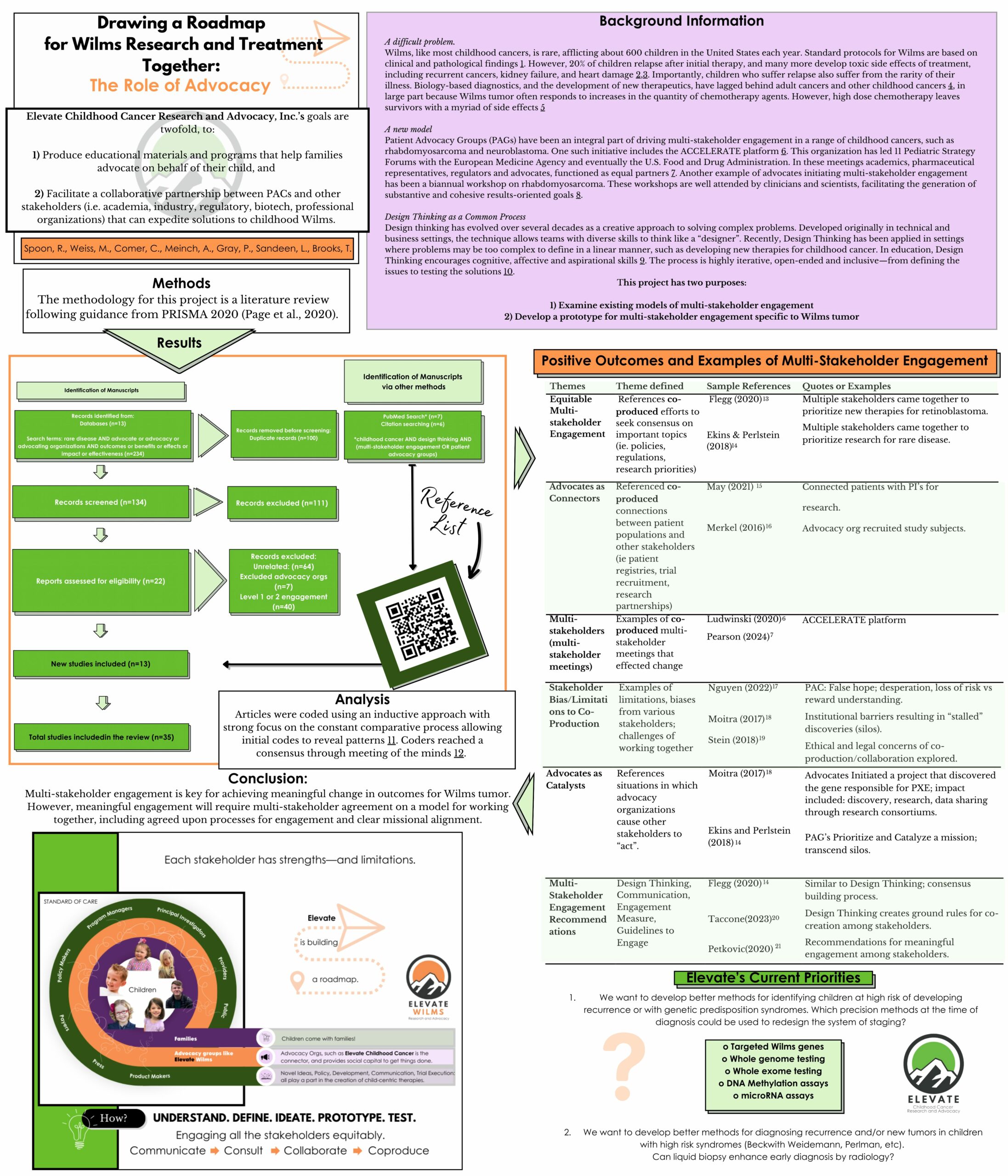 Elevate Childhood Cancer Research and Advocacy stands in the center of the myriad of stakeholders involved in changing the future for kids diagnosed with cancer, serving as the glue or the connector between and among them. So, the Elevate Wilms workgroup set out to apply a scientific approach to better understanding the ins and outs of getting this done well! The first step was to identify appropriate databases to search for keywords related to other groups and organizations that have attempted to bring out positive change for childhood cancer or a pediatric rare disease through multi-stakeholder engagement.