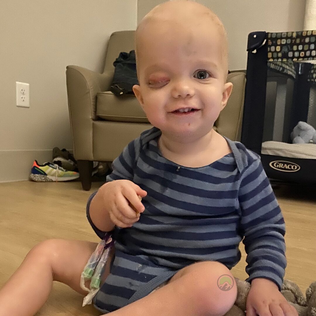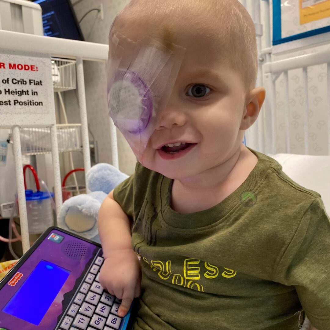When the first symptoms appeared, the one eye larger than the other, followed by unexplained nausea, vomiting, pain and constant ‘cold symptoms’ they were told, after visiting the pediatrician, we would be waiting for an appointment with ophthalmology which would have taken several weeks. Bennett’s parents finally had enough and took him in to the ED to be seen. A head CT confirmed a mass in his orbit. The family was sent to a hospital in Miami for biopsy. Once they arrived they sent them home and told them it was just a cyst. The mass continued to grow and Jessica took Bennett back a week later. They finally biopsied and confirmed it was Rhabdomyosarcoma. It was almost a month before they reached a diagnosis.