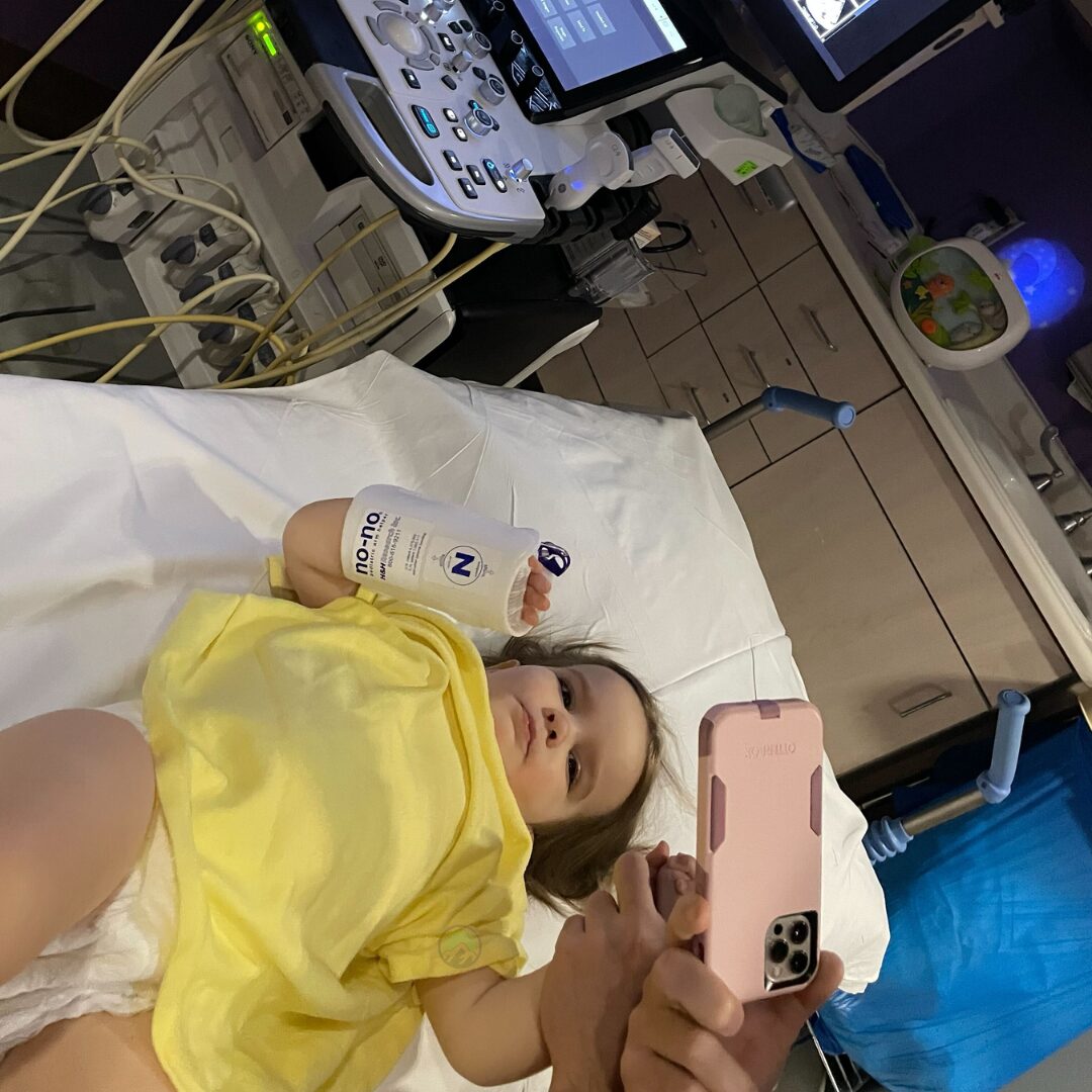 Over the course of 12 days (which included Christmas and New Years), Ellie kept spiking fevers, which would disappear without medicine and then return. After her belly became distended, on January 7, 2022 her parents took her to the ER. Within 6 hours they knew she had a malignant tumor, and the next morning, she had surgery to collect a biopsy and put in a chemo port. Ellie’s tumor was teh size of a baseball, and it had burst, causing fevers. The biopsy results returned on January 13th–Rhabdomyosarcoma (RMS). Ellie was still inpatient and they started her on chemotherapy the same day. A PET scan confirmed no metastasis. RMS subtype and official diagnosis arrived a few days later–Stage 3 embryonal rhabdomyosarcoma (ERMS).