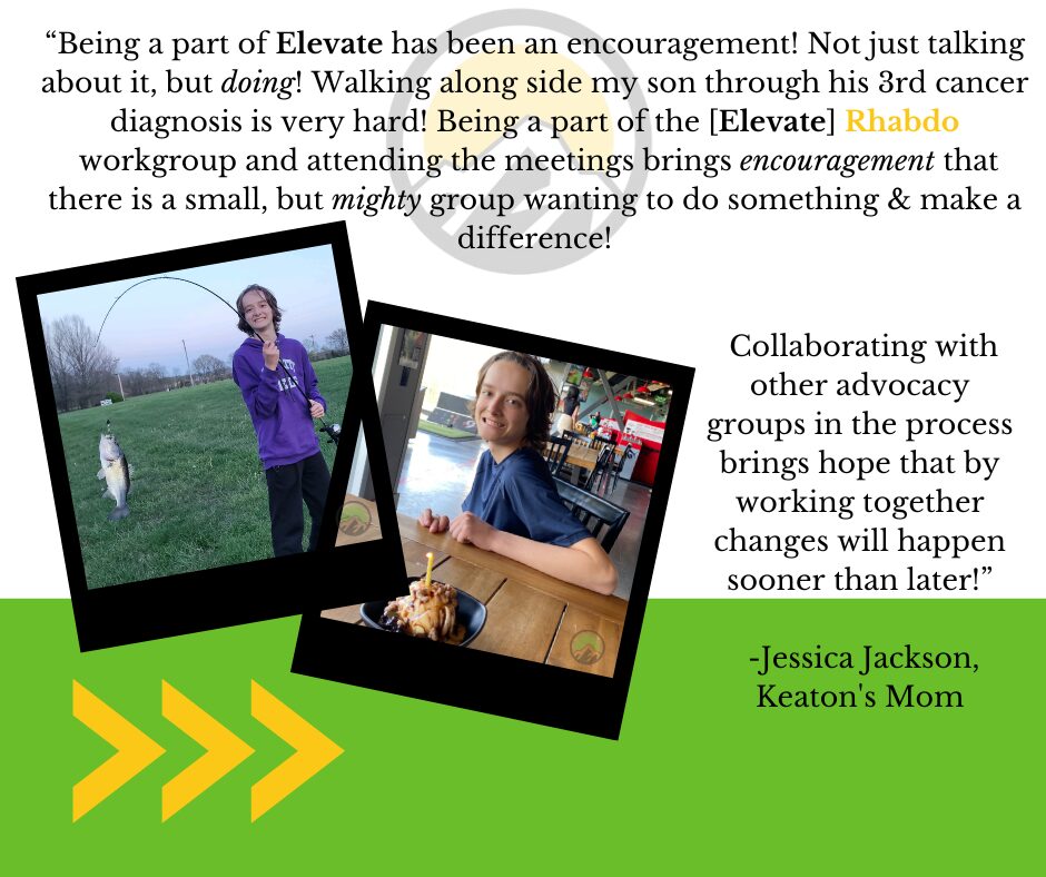 “Being a part of Elevate has been an encouragement! Not just talking about it, but doing! Walking alongside my son through his 3rd cancer diagnosis is very hard! Being a part of the [Elevate] Rhabdo workgroup and attending the meetings brings encouragement that there is a small, but mighty group waiting to do something and make a difference. Collaborating with other advocacy groups in the process brings hope that by working together changes will happen sooner than later! ”
